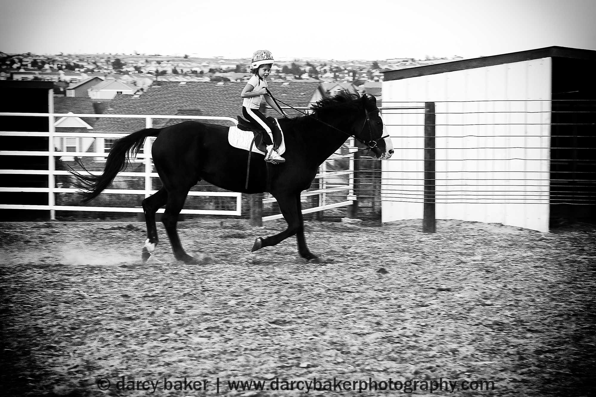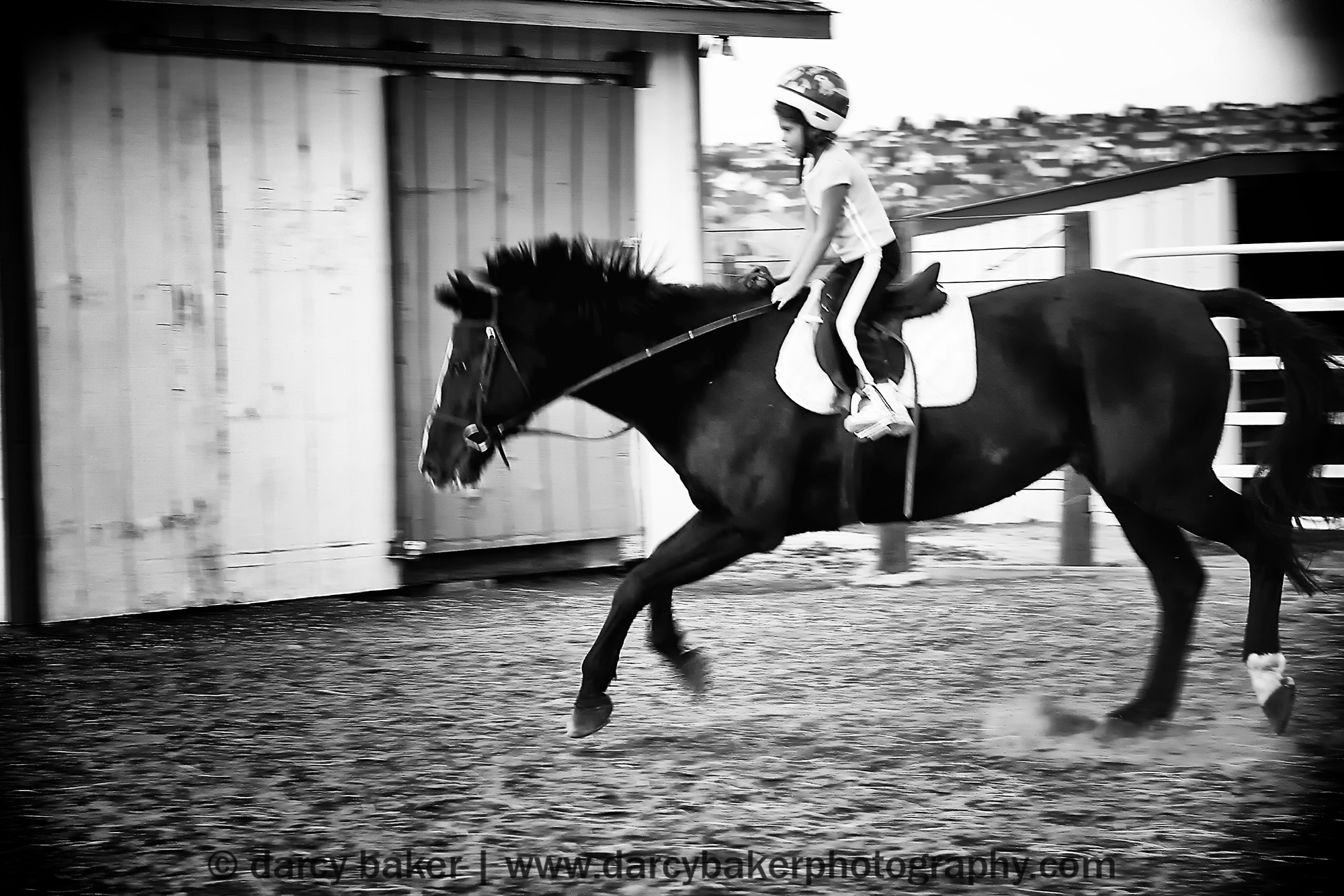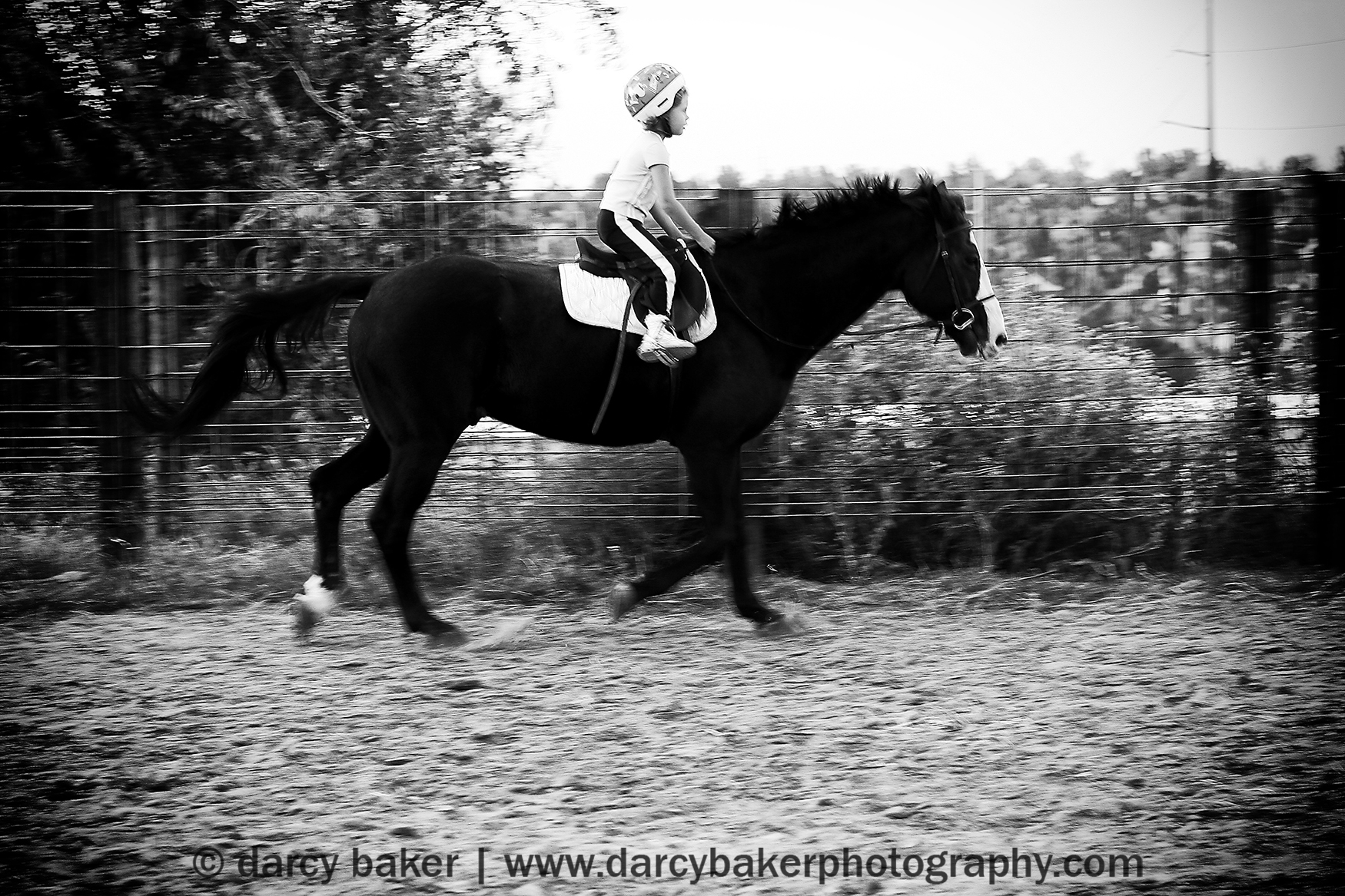 And then in a blink of an eye, a fraction of a second and barely a push of the shutter button things took a turn for the worse. A fox had run out in front of Jaguar and spooked him. I didn’t see the fox through the viewfinder of my camera however I saw the mood of that horse change faster than I could throw the camera down to the ground (you’ll notice that particular picture is slightly blurry and the last one in the series). In utter horror I watched a spooked Jaguar buck like a freak show with my little baby hanging on for dear life on his back. The camera hit the gravel as both the trainer and I scrambled after Jaguar to save my daughter. And all I could think about was my daughter getting tossed and broken into a million pieces.