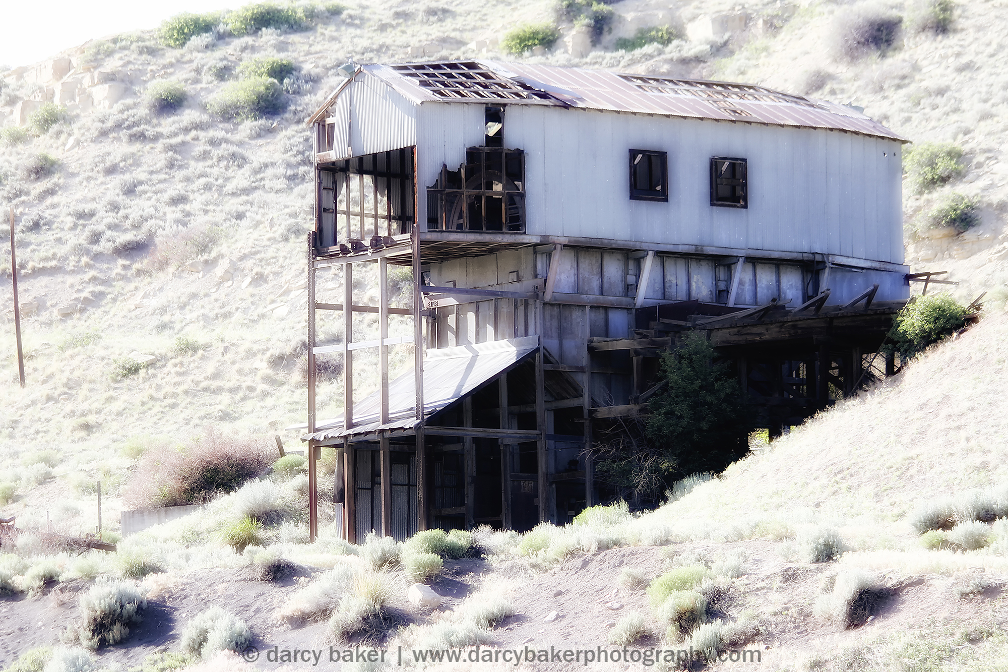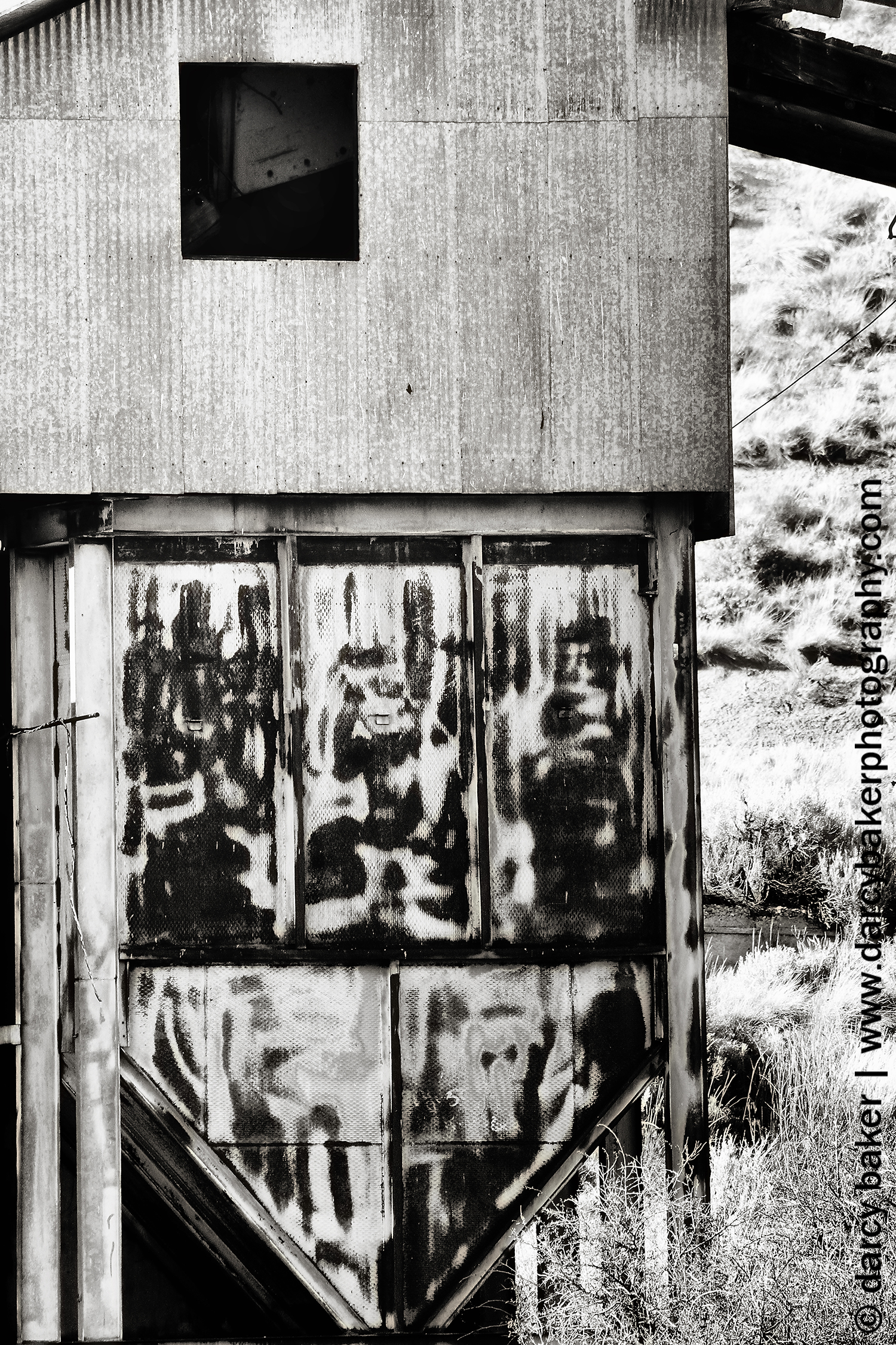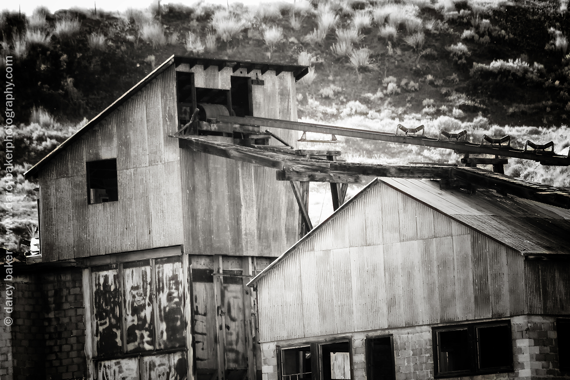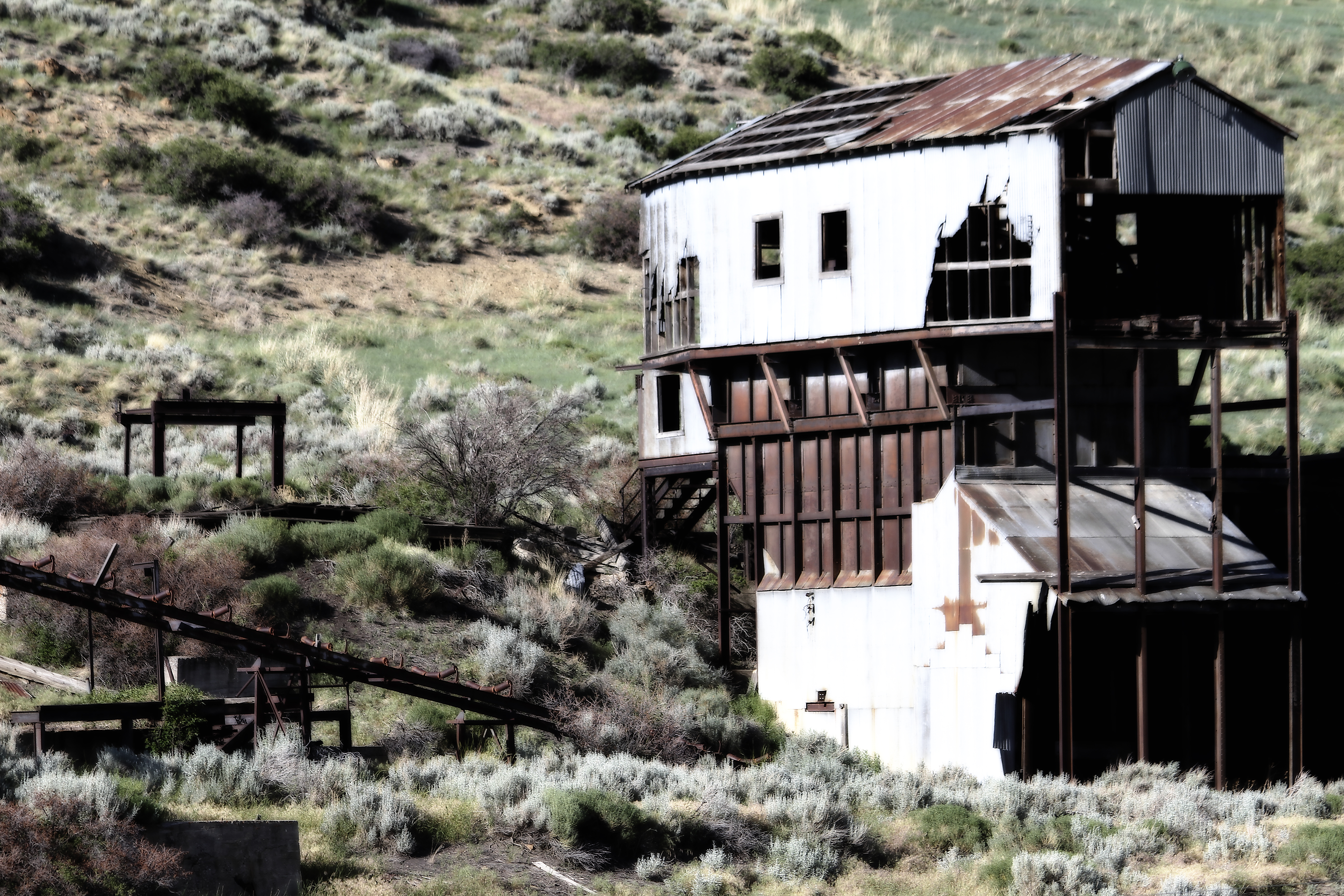 I pull off to the side of the road and start taking pictures. It was erie standing alone in the dead silence with that mine up on the hill. There wasn’t a sound save for a piece of metal on the roof of one of the buildings. It swayed and squeaked reluctantly and ever so slowly in retaliation to the blowing wind.