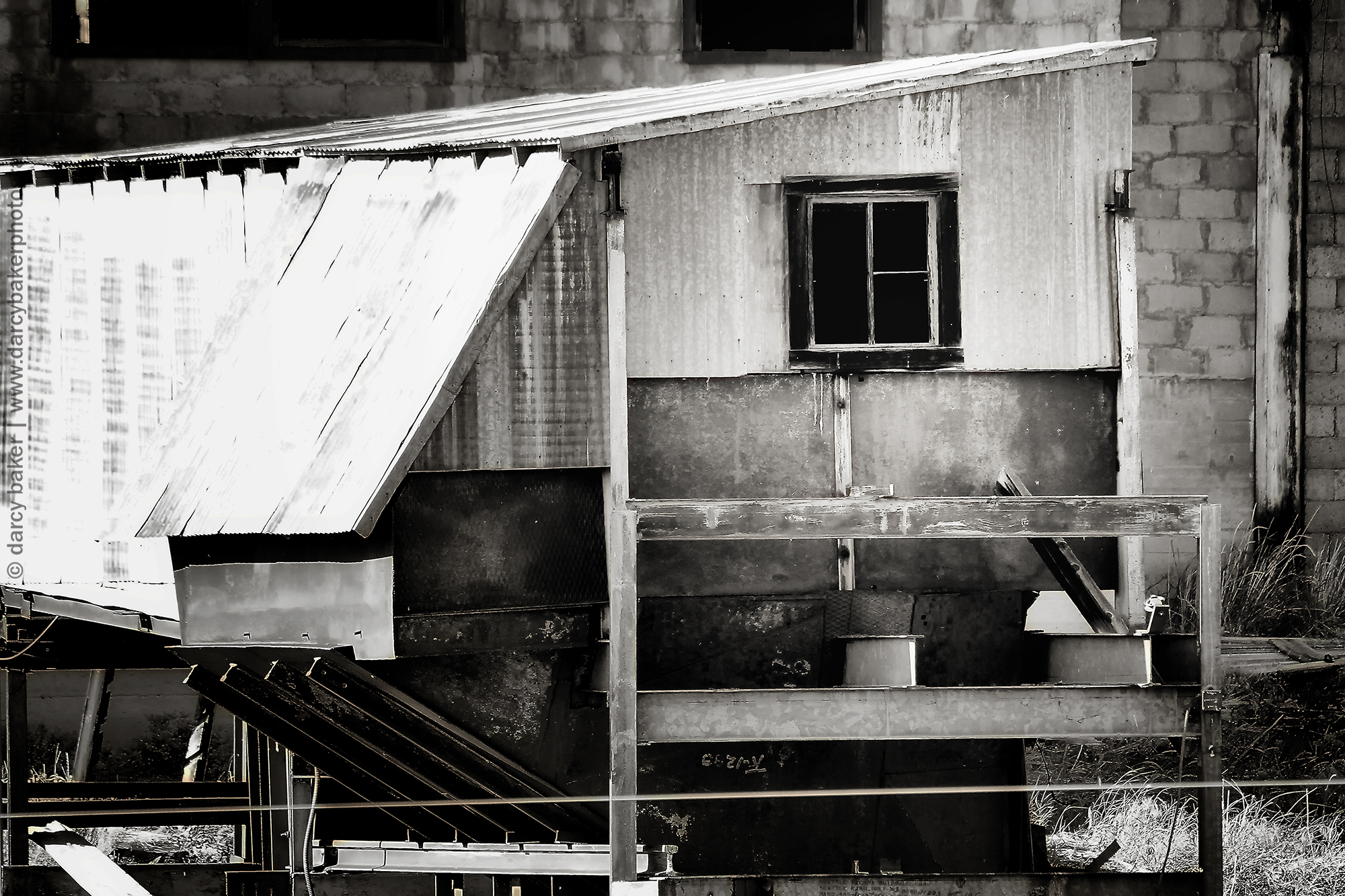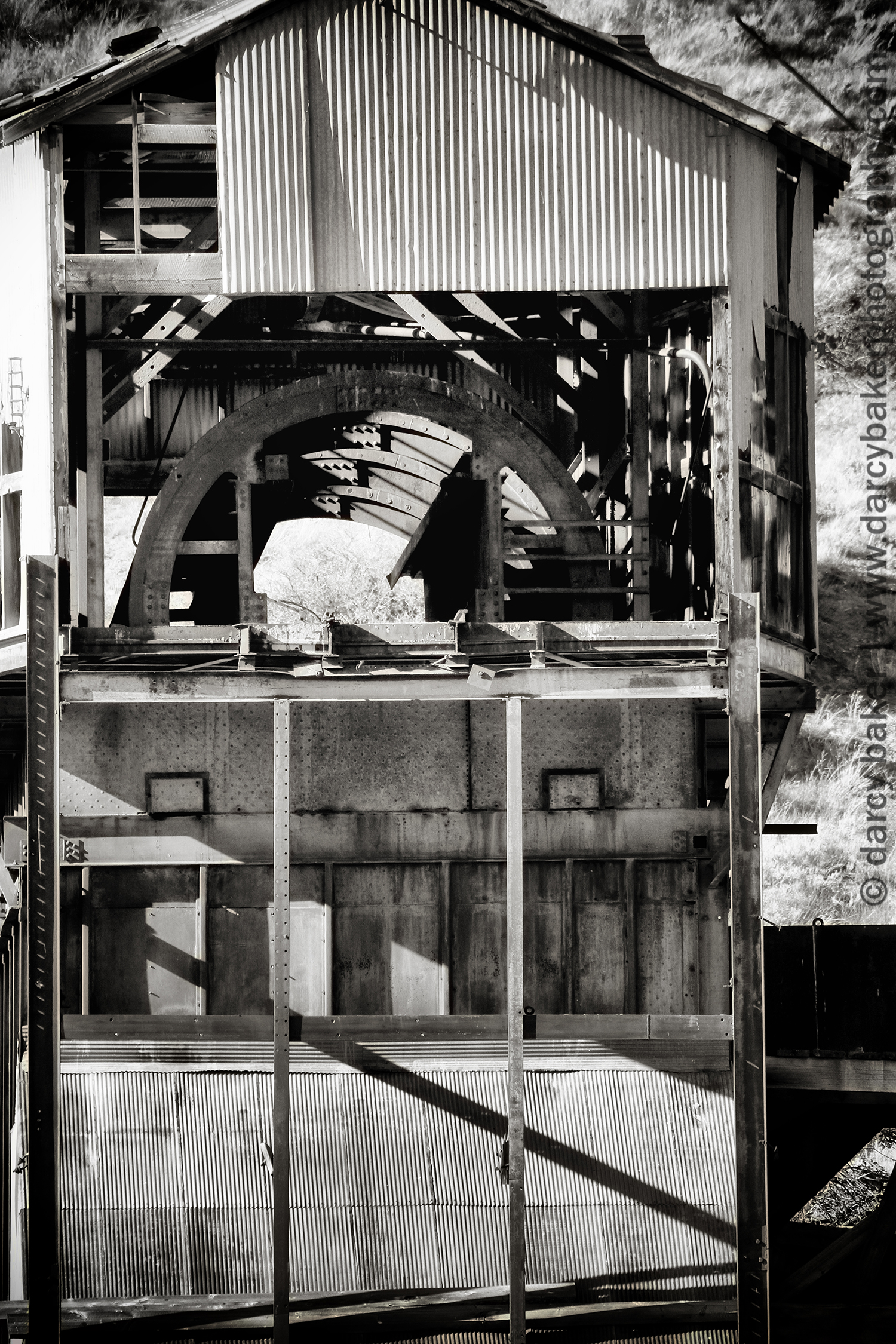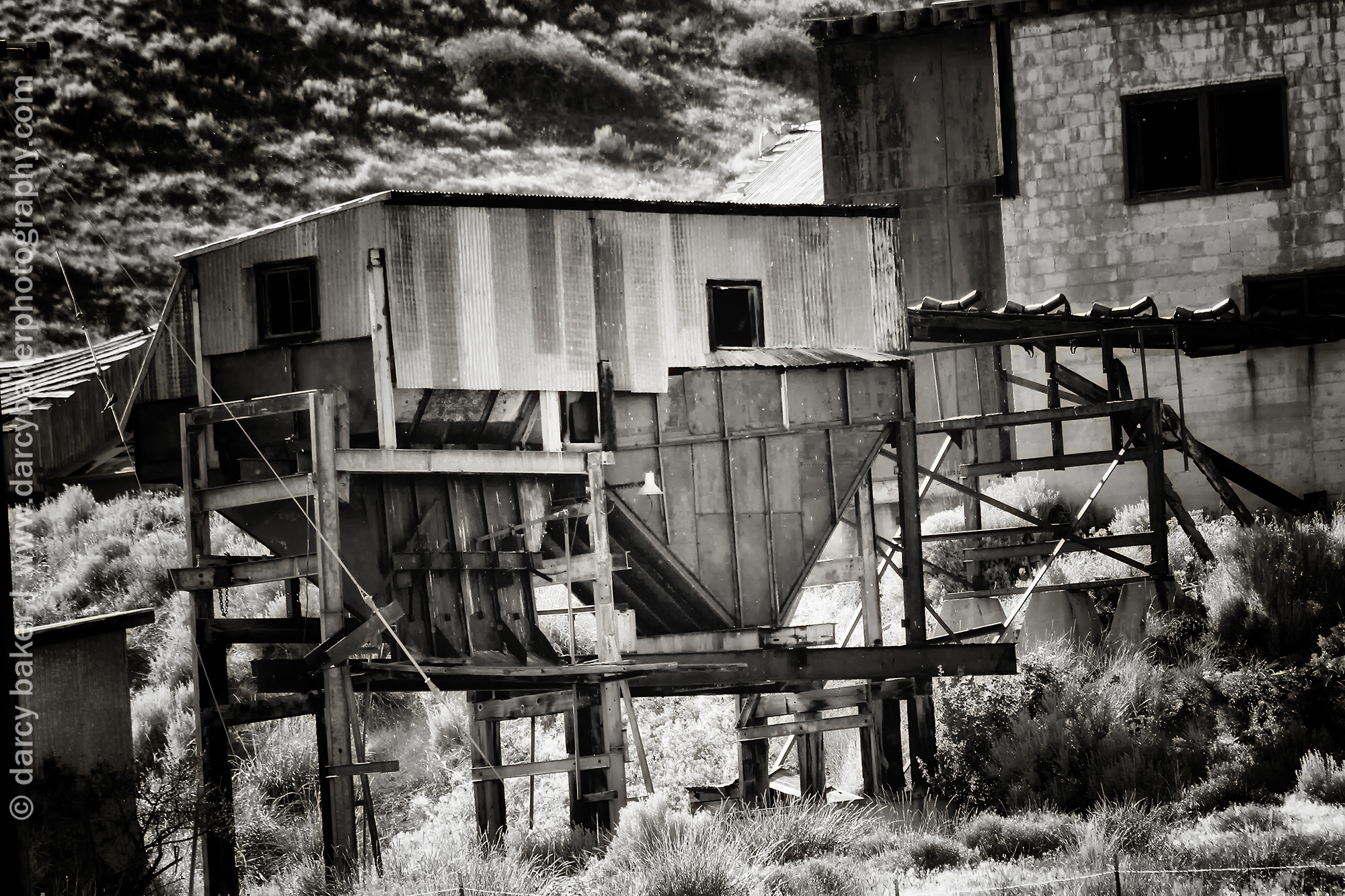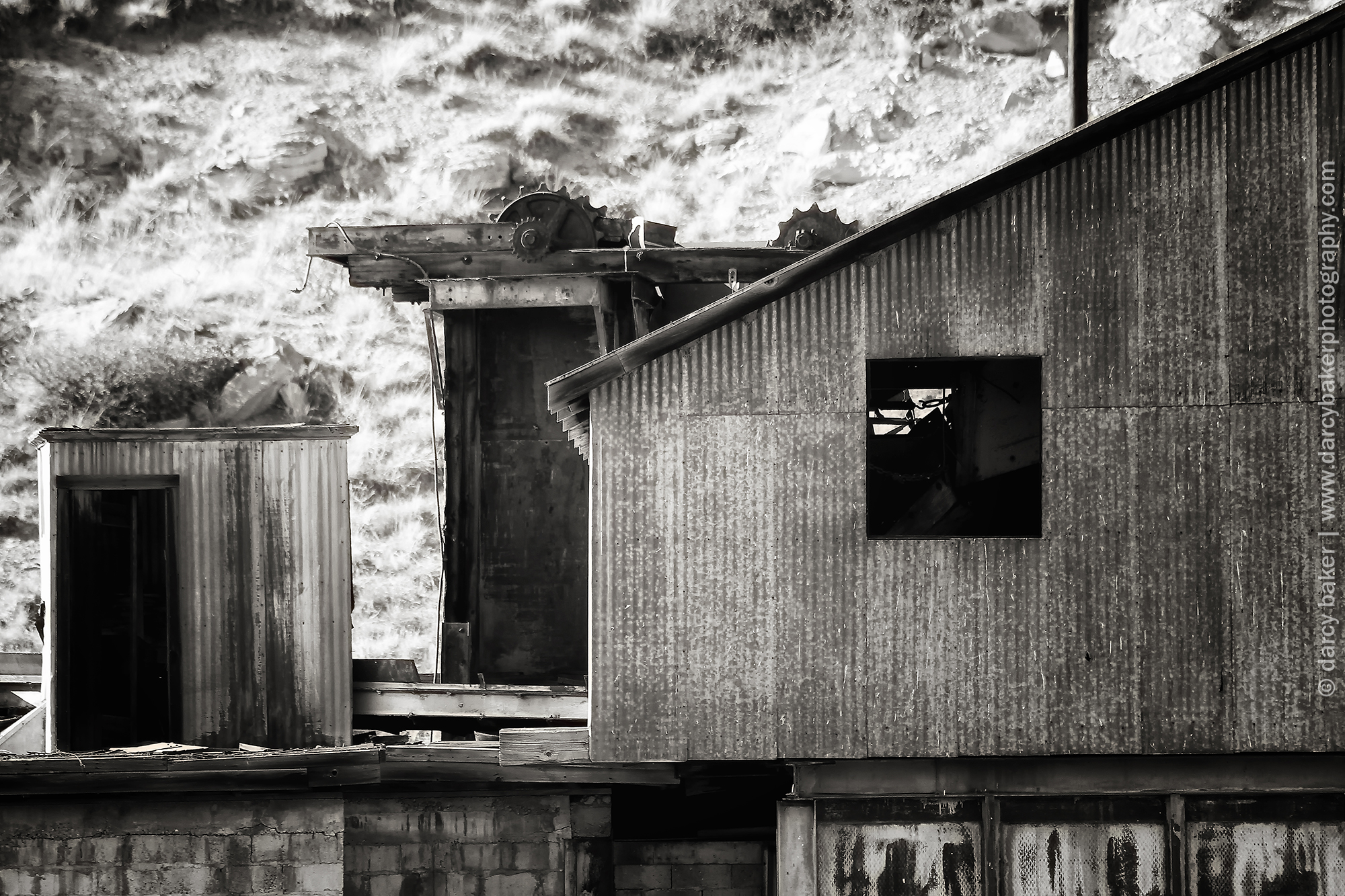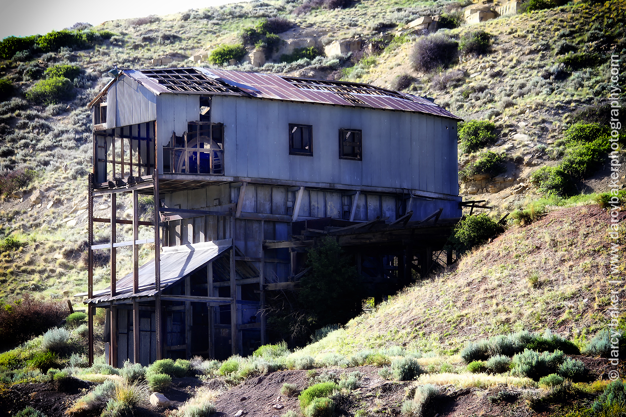 I pull off to the side of the road and start taking pictures. It was erie standing alone in the dead silence with that mine up on the hill. There wasn’t a sound save for a piece of metal on the roof of one of the buildings. It swayed and squeaked reluctantly and ever so slowly in retaliation to the blowing wind.